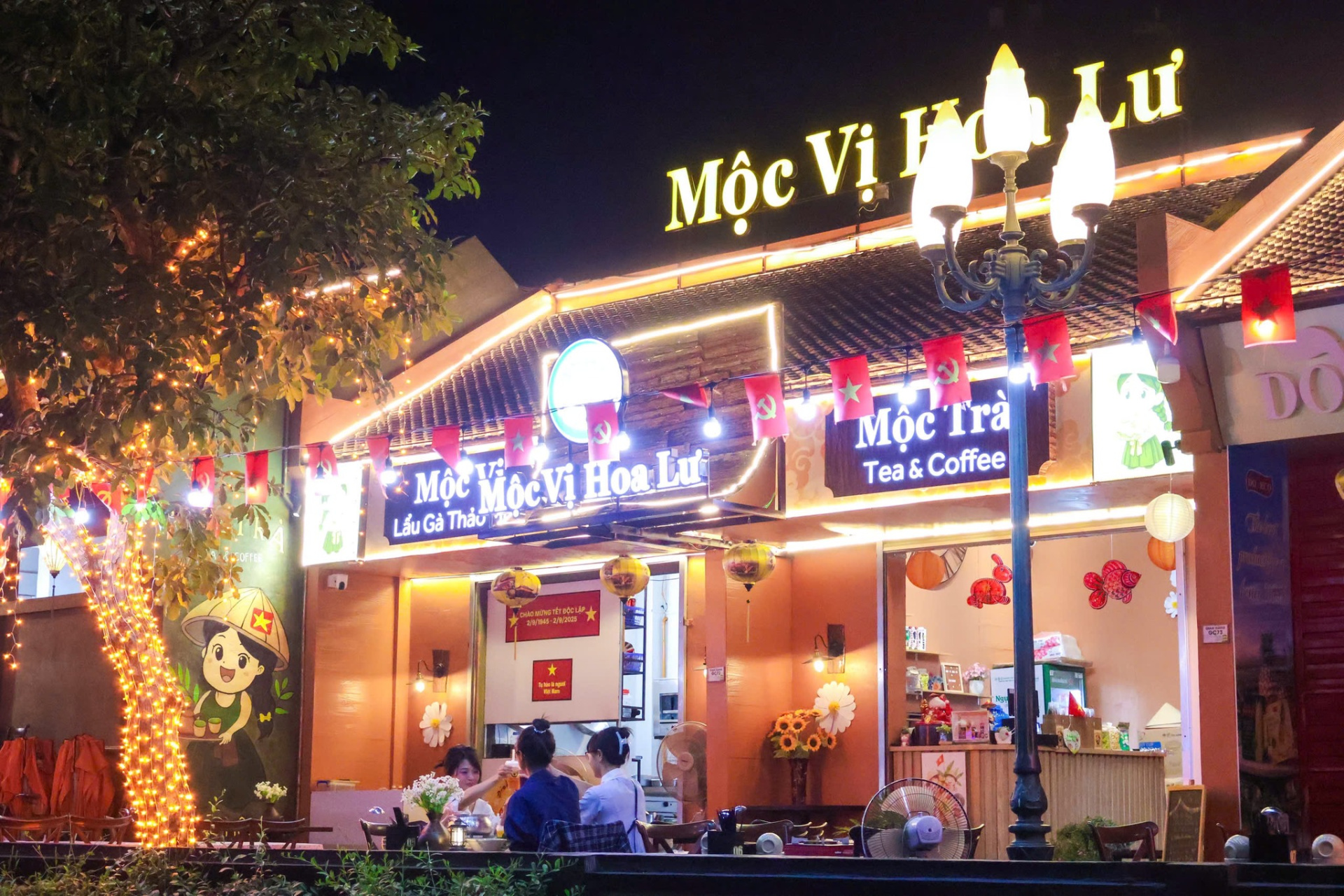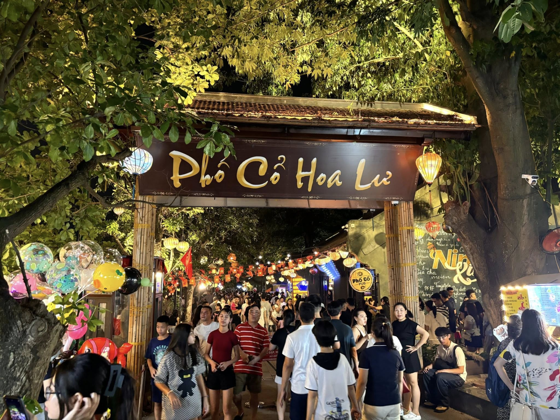 The entire area is designed in the style of the 10th century, reflecting the spirit of ancient Hoa Lu, the capital of Vietnam during the Dinh and Le dynasties. Walking along the street feels like stepping back in time, with lantern-lit shops, traditional wooden houses, and bustling food stalls.