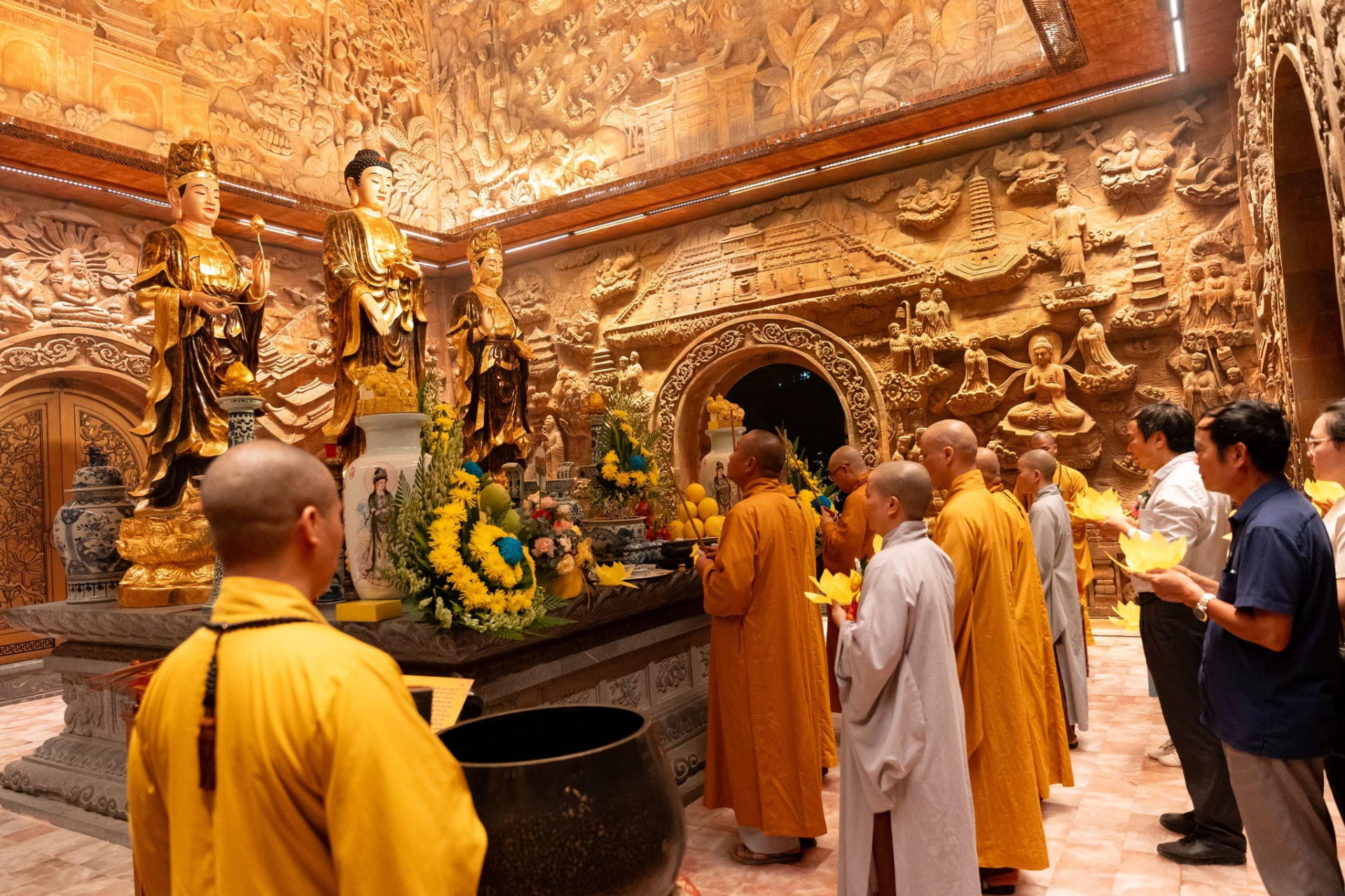 The highlight of the complex is the Silver Pagoda (Ky Lan Son Tu), a 27-meter-tall pagoda built from red granite, standing right in the middle of Ky Lan Lake. Its three-layered roofs and lotus-shaped pedestal make it unique. At night, the Silver Pagoda glows under colourful lights, creating a stunning view. Inside, there are Buddha statues carved by artisans from Ninh Van Stone Carving Village, one of the most famous craft villages in Ninh Binh.